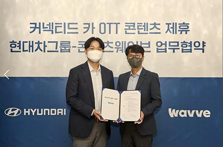 웨이브는 현대자동차그룹과 19일 여의도 콘텐츠웨이브 본사에서 \'차량용 OTT 콘텐츠 서비스 제휴 상호 협력을 위한 양해각서(MOU)\'를 체결했다고 밝혔다. 협약식에는 이태현 웨이브 대표, 최소정 전략본부장, 한원식 플랫폼기술본부장, 추교웅 현대차그룹 부사장, 권해영 상무 등 주요 관계자들이 참석했다.