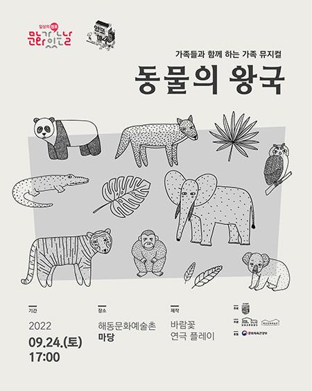 이번에 진행되는 공연 <동물의 왕국>은 가족 뮤지컬로 전문 문화예술창작 극단인 바람꽃이 무대를 준비한다.