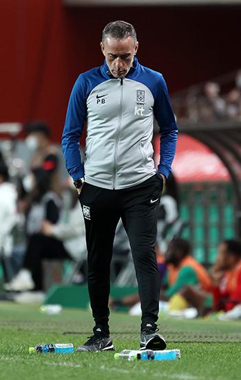 27일 오후 서울 마포구 서울월드컵경기장에서 열린 하나은행 초청 축구 국가대표 평가전 대한민국과 카메룬의 경기 후반전, 벤투 감독이 생각에 잠겨 있다. 2022.09.27.