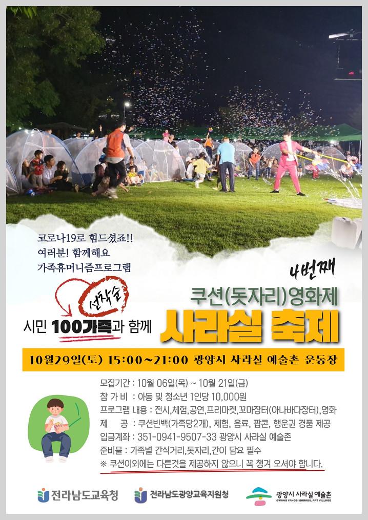 광양시 사라실예술촌이 오는 29일에 시민 100가족과 함께하는 쿠션(돗자리) 영화제를 개최한다.
