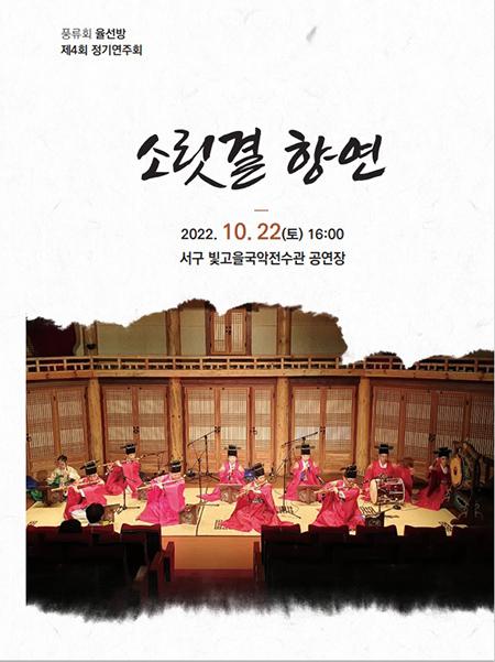 광주 서구 빛고을국악전수관 공연장에서 오는 10월 22일 토요일 오후 4시 풍류회율선방 제4회 정기연주회 풍류의 밤 “소릿결 향연” 공연을 개최 한다.