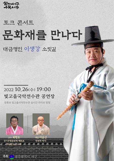 광주 서구는 26일 오후 7시 빛고을국악전수관에서 토크 콘서트 ‘문화재를 만나다’ 다섯번째 무대 이생강 문화재 초청 무대를 갖는다.