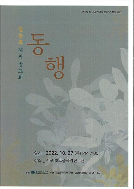 광주 서구는 27일 오후 7시 빛고을국악전수관 공연장에서 목요열린국악한마당 제 719회 김승호 대금 연주회 두 번째 ‘동행’ 공연을 개최 한다.