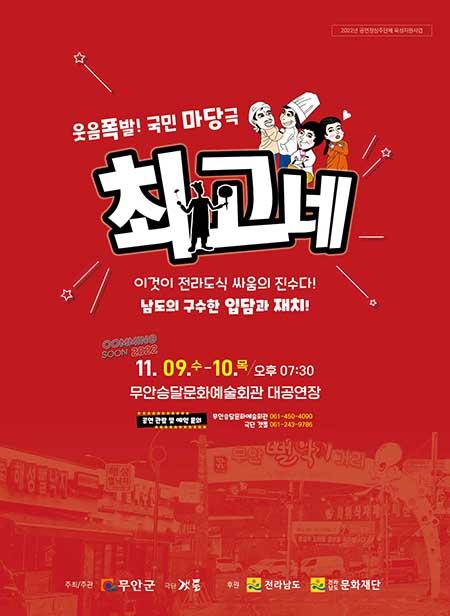 무안군은 오는 9일과 10일 2일간 오후 7시 30분에 승달문화예술회관 대공연장에서 서로가 원조라고 주장하는 뻘낙지 전문식당을 운영하는 두 원수의 집안이야기를 소재로 한 유쾌한 마당극 ‘최고(崔高)네’를 상연한다.