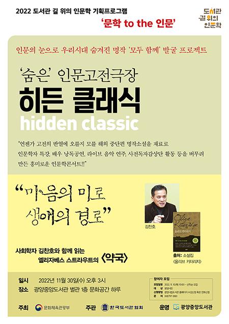 ‘히든클래식’은 문화체육관광부가 주최하고 한국도서관협회가 주관하는 도서관 ‘길 위의 인문학’ 기획프로그램으로, 전국 5개 수행기관에 광양중앙도서관이 선정돼 국비 1천만 원을 지원받는다.