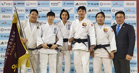 단체전 우승을 차지한 순천시청 유도팀(왼쪽부터 신지영, 양서우, 박다솔, 김지정, 김혜미, 김양호 감독)