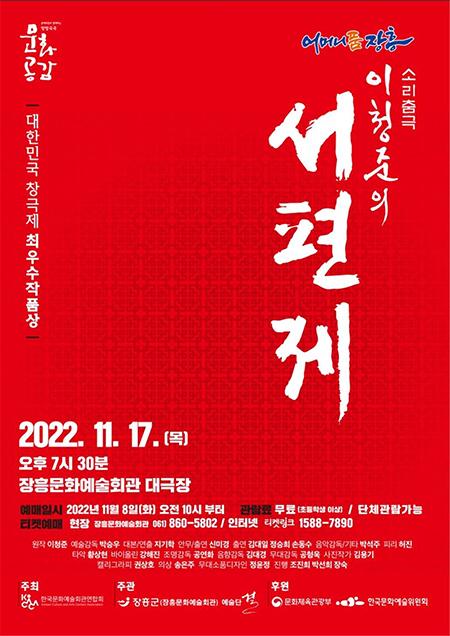 장흥군은 17일 저녁 7시 30분 장흥문화예술회관 대공연장에서 ‘소리춤극 이청준의 서편제’ 공연을 개최한다고 전했다.