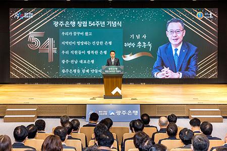 광주은행이 18일 본점에서 창립 54주년을 맞아 송종욱 행장을 비롯한 임직원과 감사고객 등이 참석한 가운데 기념식을 열었다.