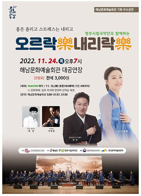 해남군은 국악콘서트 ‘오르락樂 내리락樂’을 오는 24일 저녁 7시 대공연장에서 개최한다.