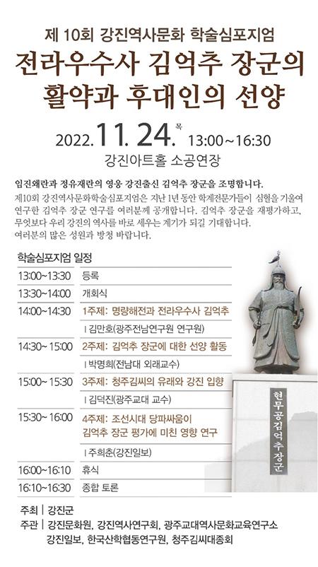 ‘전라우수사 김억추 장군의 활약과 후대인의 선양’을 주제로 열리는 제10회 강진역사문화 학술심포지엄은 4개의 주제 발표와 종합토론으로 진행된다.