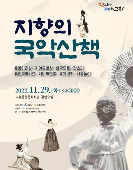 고흥군은 29일 오후 3시 고흥문화회관 김연수실에서 기획공연으로 ‘지향의 국악 산책’ 막을 올린다고 밝혔다.