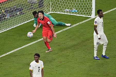 2022 카타르 월드컵에서 조규성이 가나를 상대로 골을 넣은 뒤 기뻐하고 있다. 2022.11.28