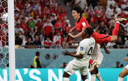 28일(현지시간) 카타르 알라이얀 에듀케이션 시티 스타디움에서 열린 2022 카타르 월드컵 H조 2차전 대한민국과 가나의 경기, 한국 조규성이 동점골을 넣고 있다. 2022.11.28.