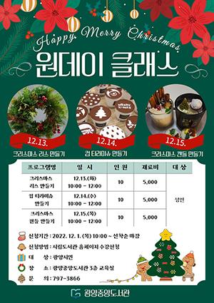 광양중앙도서관은 크리스마스를 맞아 오는 13~15일 3회에 걸쳐 ‘크리스마스 원데이 클래스’ 프로그램을 운영하기로 하고, 프로그램 수강생을 모집한다고 밝혔다.