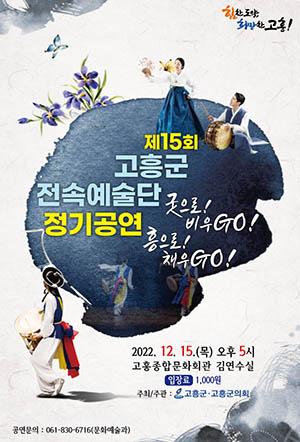 고흥군은 오는 15일 오후 5시 고흥종합문화회관 김연수실에서 제15회 전속예술단 정기공연으로 ‘굿으로! 비우GO! 흥으로! 즐기GO!’를 진행한다고 밝혔다.