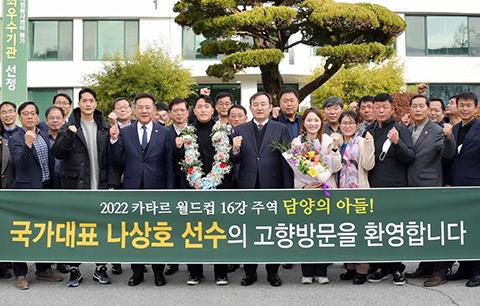 담양 수북면 출신인 나 선수는 가족들과 함께 이날 담양군청을 방문해 이병노 군수로부터 꽃다발과 특산품을 전달받고, 감사의 뜻으로 현장에서 사인볼을 이 군수 등에게 건넸다.