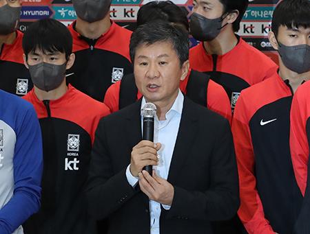 2022 카타르 월드컵에서 16강 진출 성적을 거둔 한국 축구대표팀 정몽규 대한축구협회 회장이 7일 오후 인천국제공항을 통해 귀국한 뒤 소감을 말하고 있다. 2022.12.07.