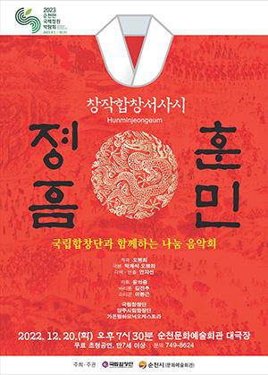 국립합창단이 K-합창 시리즈로 창작한 칸타타 창작합창서사시‘훈민정음’은 세종대왕의 애민정신이 담긴 훈민정음의 창제 과정을 합창곡으로 흥미롭게 풀어낸 작품으로 총 3부로 구성되어있다.