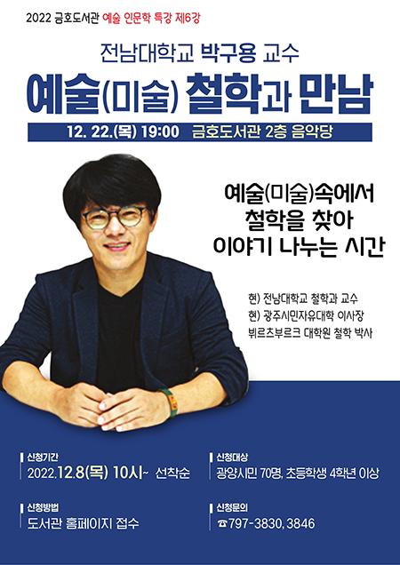 이용민 금호도서관팀장은 “박구용 교수의 강연을 통해 지역주민이 예술에 접근하는 새로운 방향을 알게 되고 자유롭게 소통하는 소중한 시간이 될 것이다”고 말했다.