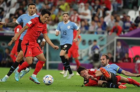 24일(현지시간) 카타르 알라이얀 에듀케이션 시티 스타디움에서 열린 2022 카타르 월드컵 H조 1차전 대한민국과 우루과이의 경기, 나상호가 돌파를 시도하고 있다. 2022.11.24.