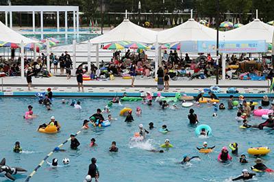 여름 날씨를 보인 7일 오전 서울 영등포구 여의도한강공원 수영장을 찾은 시민들이 물놀이하고 있다. 2022.08.07.