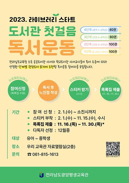 이는 전라남도교육청 제7차 라이브러리 스타트 북을 활용하여 단계별 목록집 배부, 다독자 선발 등이 이루어질 예정이다.