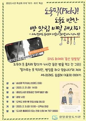 이번 특강은 도둑이 돈을 훔치러 들어와 4시간 동안 빵을 먹고 가 SNS에 ‘용산 장발장’, ‘현대판 장발장’으로 유명해진 ‘써니브레드’의 송성례 대표를 초청해 ‘도둑 픽(Pick)! 도둑도 반한 빵 맛집 비밀 레시피’라는 주제로 내가 하고 싶은 일을 시작하고 성장시킨 이야기를 들려줄 예정이다.