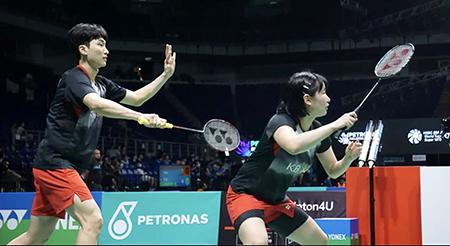 화순군청 소속 정나은 선수가 국제 대회에서 혼합 복식 3위를 차지했다. 사진은 대회에서 플레이 중인 정나은 선수(사진 오른쪽)와 김원호 선수(사진 왼쪽)의 플레이 모습.