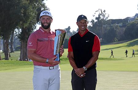\'2023 제네시스 인비테이셔널\' 우승자 존 람이 우승 트로피를 들고 타이거 우즈와 기념 촬영을 하고 있다. (사진=현대자동차 제공) 2023.02.20