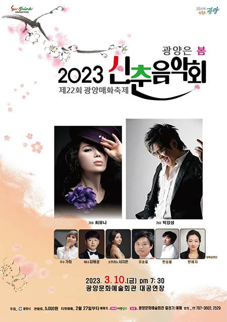 광양시는 오는 3월 10일 오후 7시 30분 문화예술회관 대공연장에서 \'2023 신춘 음악회\'를 개최한다고 밝혔다.