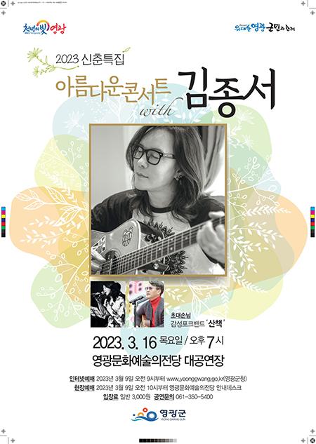 영광군은 오는 16일 오후 7시에 영광문화예술의전당 대공연장에서 신춘특집‘아름다운 콘서트 With 김종서’공연을 펼친다.