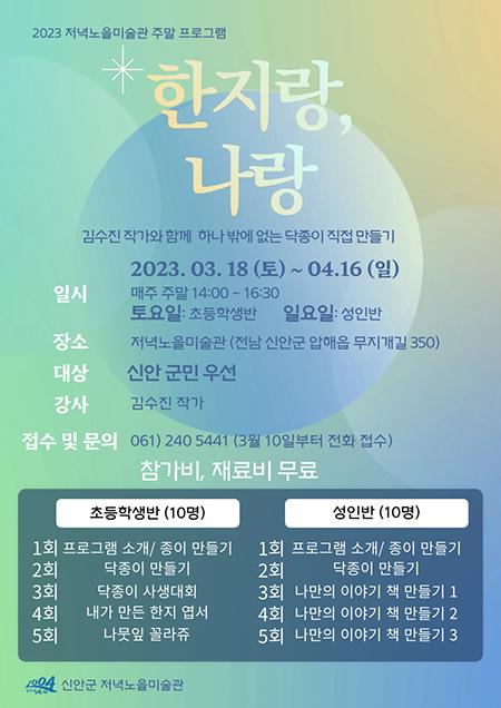 신안 저녁노을미술관에서는 신안군민 초등학생 및 성인을 대상으로 오는 18일 부터 4월 16일까지 주말교육프로그램 \'한지랑, 나랑\'을 운영한다.