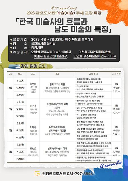 광양금호도서관은 지난해 예술(미술,음악) 인문학 특강에 이어 올해 「한국 미술사의 흐름과 남도 미술의 특징」을 주제로 호남지역 내 미술계 저명인사를 초청해 오는 4월부터 7월까지 12회에 걸친 예술(미술) 주제 교양 특강을 운영한다고 밝혔다.