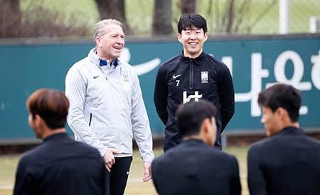 축구대표팀 손흥민과 쾨프케 골키퍼 코치가 22일 경기 파주시 축구 국가대표 트레이닝센터(NFC)에서 훈련 전 대화를 나누고 있다. 대표팀은 24일 콜롬비아, 28일 우루과이와의 평가전을 앞두고 있다. 2023.03.22.