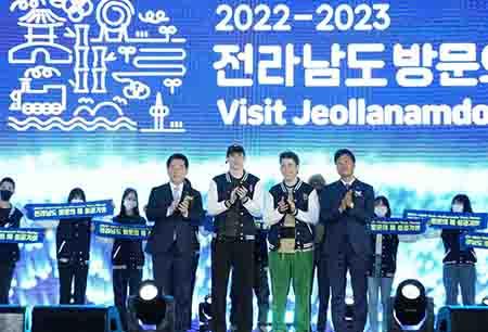 김영록 전남도지사(왼쪽)가 21일 밤 서울 광화문광장에서 열린 \'2022∼2023 전남 방문의 해\' 시즌 2 서울페스티벌 행사에서 인플루언서 \'영국남자\', 내외국인 20명과 관광홍보단 출정식을 하고 있다. /전남도 제공 2023.03.21.