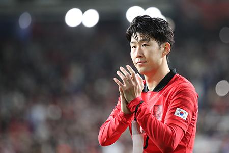 24일 오후 울산 남구 문수축구경기장에서 열린 하나은행 초청 축구 국가대표 평가전 대한민국과 콜롬비아의 경기 종료 후 손흥민이 인사하고 있다. 2023.03.24.