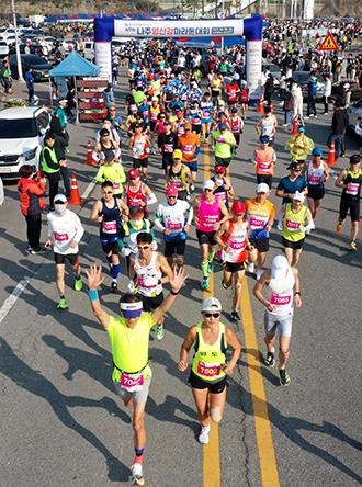 마라토너 3000여 명이 벚꽃과 유채꽃이 활짝 핀 전남 나주 영산강변을 따라 갈고 닦은 기량을 뽐냈다.