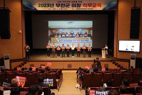 무안군은 행정의 최일선에서 고생하는 이장들의 사기진작과 능력개발을 위한 ‘2023년 이장 역량 강화 직무교육’을 지난 4일 무안군 승달문화예술회관 대강당에서 개최했다고 밝혔다.