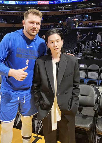 지난 1월엔 미국 캘리포니아 주(州) 로스앤젤레스(LA) 크립토닷컴 아레나에서 열린 미국 프로농구(NBA) LA레이커스 대 댈러스 매버릭스의 경기를 현장에서 직접 관람했다. 경기 내내 진지한 모습으로 선수들의 움직임을 눈으로 빠르게 쫓았다. LA레이커스의 유니폼도 선물 받았다. 특히 NBA의 슈퍼스타인 루카 돈치치(24·댈러스 매버릭스)와 만나 함께 사진을 찍었다. 슈가는 패션 관련 행사 참석을 위해 LA를 방문했는데, 바쁜 스케줄에도 NBA 현장을 찾은 것으로 알려졌다.