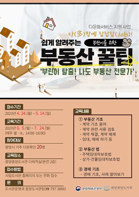 「다(多)함께 잡잡잡(job)!」은 광양시 거주 다문화인 누구나 참여할 수 있으며, 교육 관련 자세한 사항은 도서관운영과 중앙도서관팀으로 문의(☎061-797-3864)하면 된다.