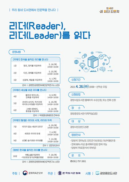 광양중앙도서관은 10년 연속 사업 수행기관으로 선정됐으며, 올해는 오는 5월 18일부터 7월 20일까지 10주간 ‘리더(Reader), 리더(Leader)를 읽다’ 프로그램을 운영한다.