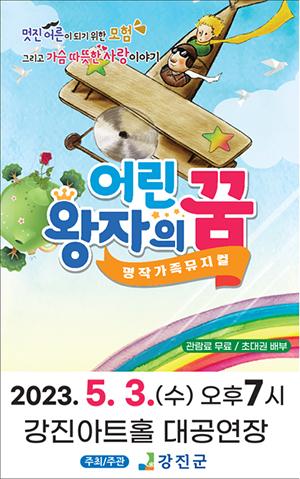 어린 왕자의 꿈은 가정의 달과 어린이날을 맞아 강진군이 기획한 공연으로 관람료는 무료이며 5월 1일부터 강진아트홀 매표소에서 초대권을 배부한다. 관람 문의는 강진군청 문화관광실 061) 430-3973으로 하면 된다. /강진=한홍수 기자