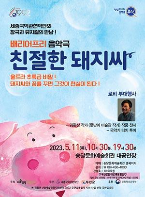 이번 공연은 세종국악관현악단이 제작한 음악극 <친절한 돼지씨>(신정민 작)로 동화와 국악이 조화롭게 어우러지며 소리꾼, 뮤지컬 배우, 수어 통역 배우, 국악 라이브 밴드가 출연한다. 천편일률적인 장래 희망에서 벗어나 어린이들에게 무한한 상상력을 유도하고 자신이 진정으로 원하는 꿈을 자유롭게 꿀 수 있도록 안내하는 원작을 기반으로 창극과 뮤지컬의 신선한 조합으로 기발한 발상과 흥미로운 상황을 설정하여 제작된 작품이다.