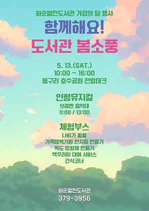 화순군은 오는 13일 동구리 호수공원 일원에서 화순열린도서관 가정의 달 행사로 “함께해요! 도서관 봄소풍”을 개최한다고 밝혔다.