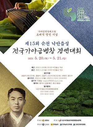 순천시에서 주최하고, (사)낙안읍성가야금병창보존회(대표 이영애)가 주관하는 ‘제15회 순천낙안읍성 전국 가야금병창 경연대회’가 순천 낙안읍성 객사 특설무대에서 오는 20일 예선경연과 21일 본선경연으로 진행된다.