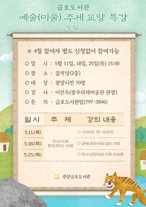 광양금호도서관이 11일 오후 3시, 금호도서관 음악당에서 예술(미술) 특강의 5월 명사로 광주의재미술관 이선옥 관장을 초청해 ‘조선시대 문인화의 이해’를 주제로 강연을 연다.