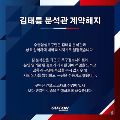 수원 구단은 11일 \"김태륭 분석관과 상호 합의하에 계약 해지하기로 결정했다\"고 밝혔다.