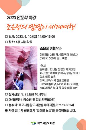 목포시립도서관은 2023 인문학 특강 <조은정의 짬짬이 세계여행>을 다음달 10일 운영한다고 밝혔다.