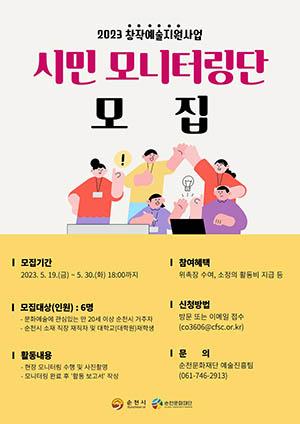 순천문화재단은 ‘2023 창작예술지원사업 시민 모니터링단’을 오는 30일까지 공개 모집한다.