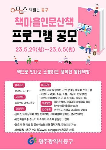 광주 동구는 ‘2023년 책 읽는 동구 사업’ 일환으로 ‘책마을 인문산책’ 프로그램에 참여할 동네 책방을 6월 5일까지 공개 모집한다고 밝혔다.